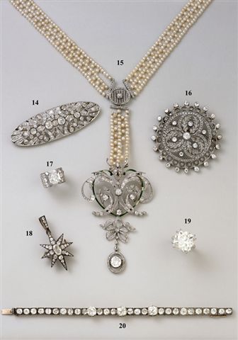 COLLIER ruban de perles fines tressées, supportant un motif volute amovible pouvant former broche, en or gris à décor d'agrafes de feuillage, serti de diamants de taille ancienne d'environ 1,80 à 2 carats, taillés en rose, retenant un diamant de taille ancienne en pampille dans un entourage de diamants taillés en rose, surmonté d'un motif noeud de ruban. La monture partiellement émaillée vert. (petits accidents et manques - à réenfiler).