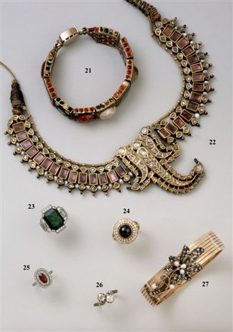 BRACELET ruban rigide et ouvrant, en or jaune ajouré, appliqué au centre d'un motif de fleurs en or et argent, serti de diamants taillés en rose et de perles fines. (manque un diamant).
