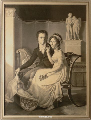 Ce dessin lève le voile sur l'intimité des jeunes époux Duport. Marie Rose Milanais de la Thibaudière (1779-1871) épousa le 5 septembre 1797 Jean-Pierre Duport (1756-1822), grand industriel et fondateur des soieries de Faverges. Au chevet de leur première fille, Anne Marie Rose, ils sont représentés dans un intérieur à l'Antique.