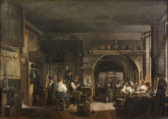Comme l'indique l'inscription, J B C Odiot ponctuée de la Croix de la Légion d'Honneur, qui décore le linteau de la poutre au fond de la pièce, François Barthélémy Augustin Desmoulins représente les vastes ateliers de Jean-Baptiste Claude Odiot.