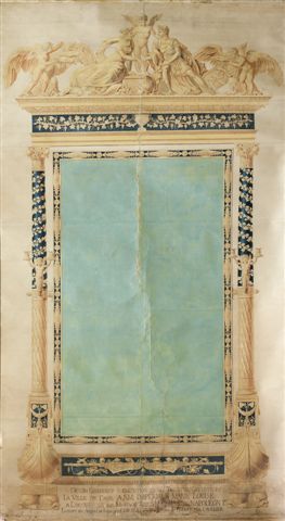 Porte en bas de la toile une inscription DESSIN GRANDEUR D'EXECUTION DE LA TOILETTE OFFERTE PAR / LA VILLE DE PARIS A.S.M. IMPERATRICE MARIE LOUISE / A L'OCCASION DE SON MARIAGE AVEC S.M. L'EMPEREUR NAPOLEON Ier / Exécutée en Argent et lapis par ODIOT d'après les Dessins de PRUDHON et CAVELIER.