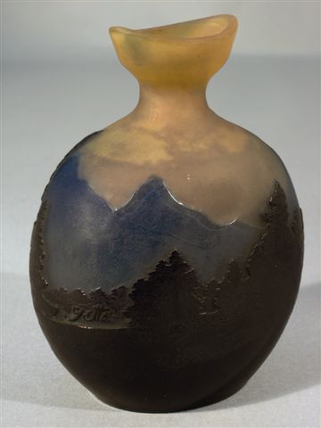 Vase boule aplatie à col élancé évasé travaillé à chaud. Verre double couche, décor sylvestre brun tournant dégagé à l'acide et repris à la meule dans la couche superficielle.