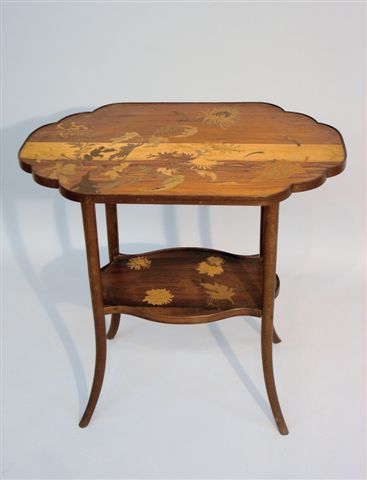 TABLE en bois de placage et marqueterie polychrome de fleurs et feuillages. Plateau polylobé à découpe chantournée reposant sur quatre pieds arqués, joints par une tablette d'entretoise. Les deux plateaux sont ornés de fleurs et feuilles de chardons, symbole de la Lorraine.