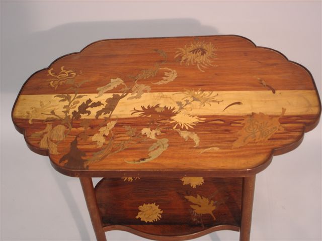Signature en marqueterie E Gallé Nancy avec la croix de Lorraine inscrite dans une feuille sur le plateau en bas à droite.