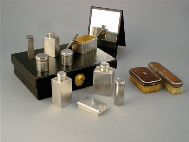 NÉCESSAIRE de TOILETTE d 'HOMME en argent, comprenant 12 pièces : trois flacons, trois boîtes de taille différente, deux brosses, deux piluliers, un miroir et un blaireau. Chaque pièce d'argent est gravée aux armes de Castillon du Perron. L'ensemble est disposé dans plusieurs compartiments et présenté dans un écrin en cuir noir.