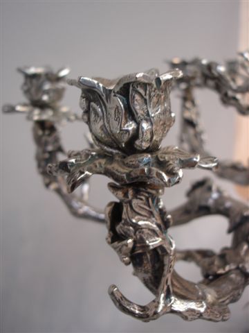 PAIRE de CANDÉLABRES à six lumières en bronze argenté. Sur la terrasse à décor naturaliste, deux chiens à l'affût rôdent autour d'un tronc d'arbre formant fût. Le tronc est entouré de feuilles et branchages, et s'épanouit en six branches à enroulements feuillagés, terminées par des bobèches formant corolles.