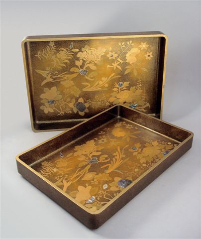 Deux beaux PLATEAUX en creux en laque du Japon pouvant former une paire malgré quelques légères différences dans les dimensions. Ils présentent un décor floral identique.