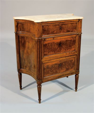 COMMODE à façade droite et aux côtés cintrés en acajou flammé et placage d'acajou. Elle ouvre à trois rangs de tiroirs. Montants antérieurs arrondis et cannelés et montants postérieurs droits et cannelés en forme de pilastre. Elle repose sur des pieds toupie.