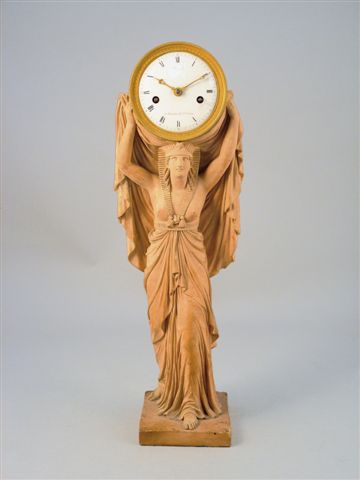 Avec la campagne d'Égypte de Bonaparte en 1798, la pendule à sujet connaît une grande vogue. Les horlogers trouvent alors dans l'Égypte ancienne une nouvelle source d'inspiration. Dès la fin du Directoire et durant toute la période consulaire, on voit apparaître une multitude de sphinx, pharaons, mastabas ornés de hiéroglyphes, pyramides et temples qui renouvellent le décor en lui donnant une forme très archéologique. Mais, dès les débuts de l'époque impériale, l'influence égyptisante entre en concurrence avec les figures de l'Antiquité gréco-romaine qui, bientôt, deviennent omniprésentes. Par l'utilisation de la terre cuite associée au bronze doré, cette pendule constitue un exemple original que l'on peut rapprocher, malgré quelques variantes, d'un dessin de l'architecte anglais Thomas Hope qui a servi de modèle pour une pendule à l'Égyptienne en bronze patiné et doré (Paris, Hôtel Drouot, 26 avril 1991, n° 149).