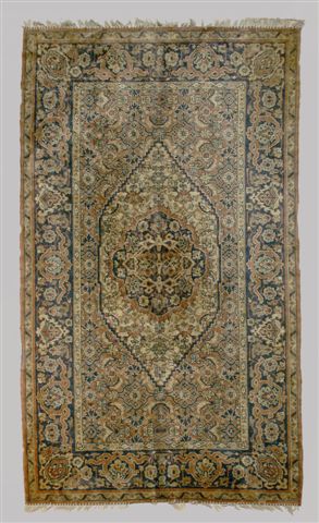 Sur un fond vieux rouge, des motifs géométriques composés de fleurs se répondent symétriquement. Le champ du tapis est entouré d'une bordure à décor de médaillons sur fond bleu. (usures).