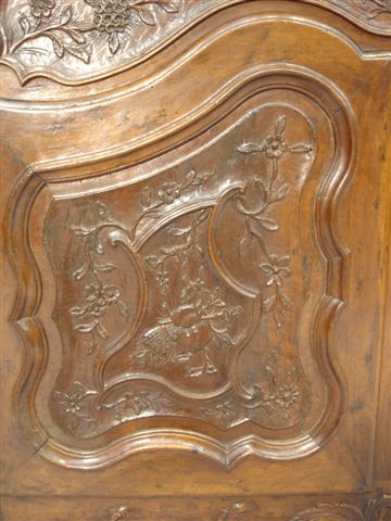 Le XVIIIème siècle constitue l'âge d'or du mobilier provençal. Les formes Louis XV à panneaux chantournés, larges moulures et pieds galbés envahissent alors les meubles. Les fustiers, ces menuisiers ébénistes des villes du Midi, s'inspirent des formes créées par les ornemanistes pour mettre au point un répertoire iconographique où les fines sculptures de motifs floraux et végétaux donnent au mobilier toute son élégance. Ce buffet constitue un bel exemple de ce travail qui, loin des modèles parisiens, a su inventer son propre langage. La sculpture est ici omniprésente : elle habille la ceinture, les vantaux, les montants et les pieds. Les branches fleuries voisinent avec les volutes, et les attributs de la campagne avec les coquilles rocailles. Une richesse toute baroque qui reste, cependant, maîtrisée par un sobre jeu de moulurations en creux et en relief sur les deux vantaux et les côtés.