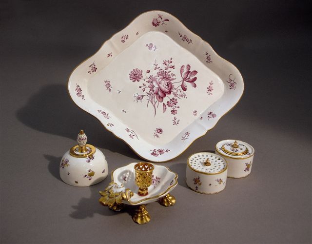 ÉCRITOIRE en porcelaine et bronze finement ciselé et doré, comprenant cinq pièces : plateau de forme chantournée, bougeoir imitant une coquille avec une prise en feuille d'acanthe reposant sur quatre petits pieds palmés dorés, une clochette, un encrier et une boîte à sable. Élegant décor floral d'un bouquet de fleurs et semis de fleurettes au pourpre de Cassius et rehauts d'or.