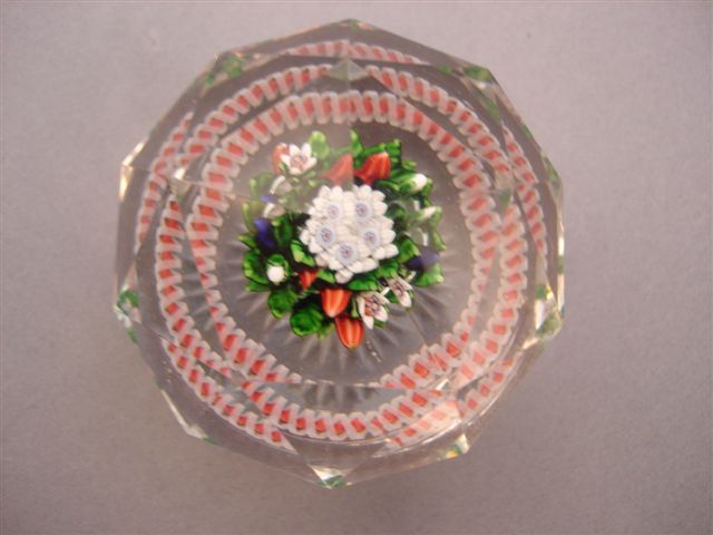 BOULE PRESSE-PAPIERS en cristal à facettes, ornée d'un bouquet de fleurettes et d'un ruban torsadé polychrome. Clichy ?, XIXème. Diam. 6,5 cm.