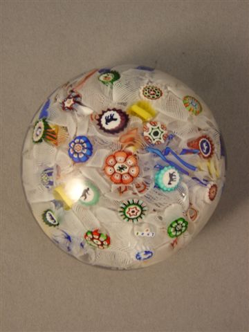 BOULE PRESSE-PAPIERS en cristal, ornée de millefiori polychromes avec neuf...
