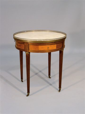 TABLE BOUILLOTTE en acajou blond et placage d'acajou. Elle est recouverte d'un marbre blanc lui même surmonté d'un plateau recouvert de cuir appelé "bouchon", encadré d'une galerie en laiton doré. La ceinture ouvre par deux tiroirs et présente deux tirettes gainées de cuir.