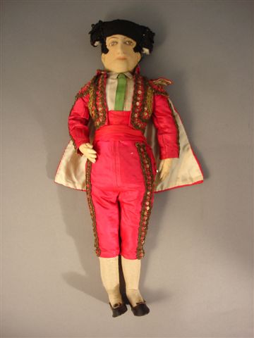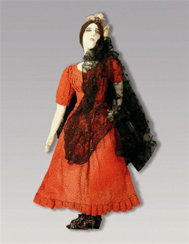 Deux POUPÉES en tissu, l'une habillée en gitane avec un châle, l'autre en Sévillane avec une mantille, signées et datées 1916 sur la cuisse gauche.