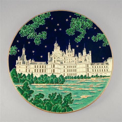 LONGWY. Grand PLAT représentant le Château de Chambord sur fond émaillé bleu turquoise et bleu de Sèvres. Rehauts d'or. Signé M.P. CHEVALLIER. Édition limitée : n° 6 sur 100 exemplaires. Monogramme : Rehaussé par Albert KIRCHTETTER (reprend son activité en 1942 et quitte son poste en 1976). Marque : Blason simple couronné entouré de la mention "ÉMAUX DE LONGWY - FRANCE ATELIER D'ART." Cette marque fut utilisée pour la première fois en 1949 et correspond toujours à des pièces en émaux d'une exceptionnelle qualité.