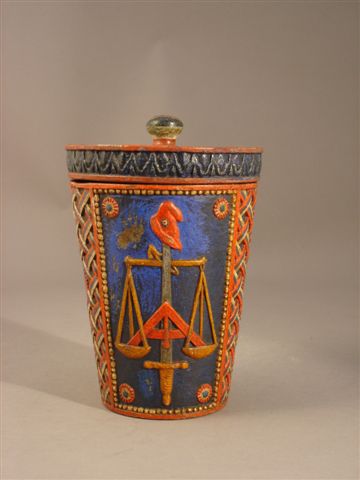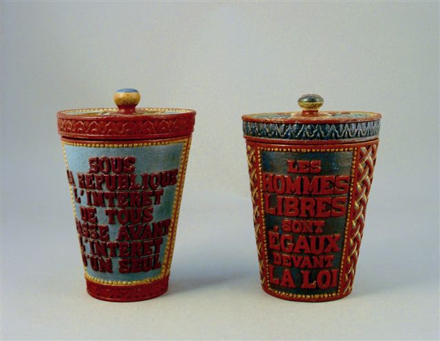 L'un des pots à tabac présente sur le couvercle un bonnet phrygien orné de la cocarde tricolore, deux branches de chêne entrelacées et une devise peinte en rouge sur fond bleu "VIVE LA LIBERTÉ". Sur la panse décorée d'un réseau de rubans tricolores centrés d'une cocarde, figure une inscription directement inspirée de la Déclaration des droits de l'homme et du citoyen du 26 août 1789 "LES HOMMES LIBRES SONT ÉGAUX DEVANT LA LOI". Dans une réserve encadrée d'un rang de perles et de quatre cocardes, le fléau de la justice, surmonté d'un bonnet phrygien, est représenté par une épée haute et par une équerre dont les branches sont posées sur deux plateaux.