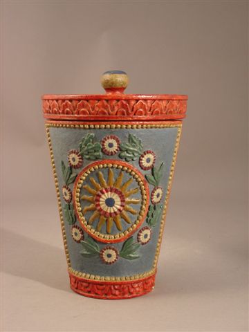 Sur le couvercle du second pot à tabac, la balance de la justice a été représentée. Le fléau est surmonté d'un bonnet phrygien. Sur la panse, un soleil révolutionnaire a été sculpté. Une couronne de feuilles de laurier et de chêne, retenues par des cocardes tricolores, l'encadre. Dans une réserve, on peut lire la devise suivante : "SOUS LA RÉPUBLIQUE L'INTERET DE TOUS PASSE AVANT L'INTERET D'UN SEUL". La République est proclamée le 22 septembre 1792. Destinés à renfermer le tabac à priser, ces pots constituent un témoignage particulièrement intéressant de la libéralisation du commerce du tabac sous la Révolution. En effet, sous l'Ancien Régime, les fermiers généraux percevaient un droit sur le tabac dont ils détenaient le monopole, ce qui en faisait un produit de luxe. C'est par une loi du 27 mars 1791 que l'Assemblée nationale mit fin à ce monopole et permit à chaque citoyen de cultiver et de vendre du tabac. Par décret du 29 septembre 1793, la Convention le classa même parmi les denrées de première nécessité et en fixa le prix maximum à vingt sous la livre. C'est dire l'importance qu'il occupait alors dans la vie quotidienne.