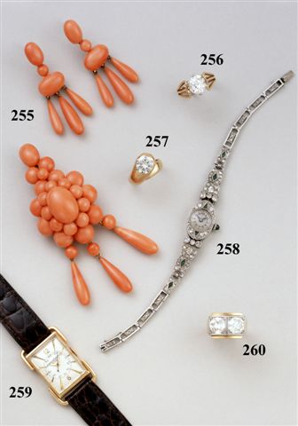 BROCHE ET PAIRE DE PENDANTS d'oreilles formant parure, en or jaune, ornés de corail cabochon et supportant chacun trois pampilles.