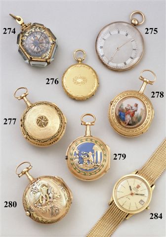 MONTRE de poche à clef, à remontage par le devant, à répétition à toc par poussoir au pendant, en or jaune gravé à décor de " L'Autel de l'Amour " partiellement émaillé. Cadran émaillé blanc, carré de remontage à deux heures, chiffres romains pour les heures, arabes pour les minutes, mouvement à coq, fusée à chaîne, échappement à roue de rencontre.