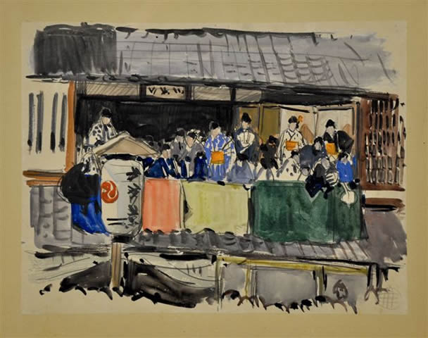 "Lors de son séjour - au Japon d'avril à aout 1914 - Méheut s'est rendu aux spectacles de Bunraku, spectacle de marionnettes de grandes tailles, créés à Osaka à la fin du XIXème siècle. Les manipulateurs des marionnettes sont totalement revêtus de noir et se déplacent devant un rideau noir."