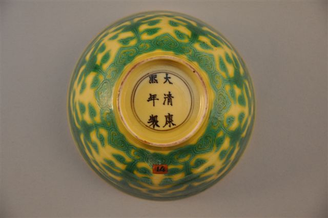 Paire de BOLS en porcelaine émaillée jaune, à décor gravé et émaillé vert de pêches de longévité et frises de lingzhi et motifs géométriques. Au revers de la base la marque Kangxi émaillé brun à six caractères.