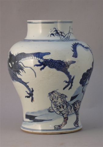 POTICHE de forme balustre, en porcelaine blanche décorée en bleu et brun sous la couverte et gravée d'un tigre sous un pin regardant un dragon parmi les nuages. Au revers de la base la marque Chenghua à six caractères en kaishu en bleu sous couverte.