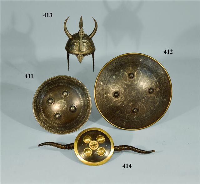 CASQUE de CÉRÉMONIE dit « Kula Kouch ». Bombe en fer forgé à masque humain, entièrement damasquiné d'argent et de points d'or, à décor de fleurs et feuillages, surmonté d'une pointe triangulaire à arête médiane et de deux cornes de part et d'autre, portant sur le devant un nasal travaillé à jours. Court camail à trois dents.