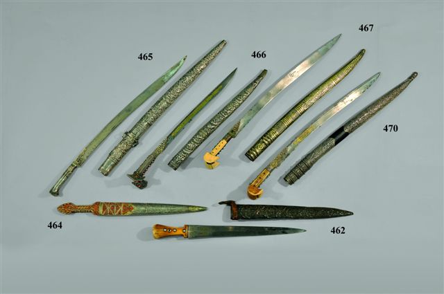 Long SABRE Ottoman dit Yatagan. Poignée à oreilles en argent gravé et ciselé de motifs et feuillages. Renfort de talon de lame en argent découpé, nielle, à décor en suite. Lame cintrée, à dos rond, gravé d'un cartouche orné d'écritures et poinçonnée. Fourreau en bois recouvert d'argent, à décor repoussé de fleurs, feuillages, fruits et rinceaux.