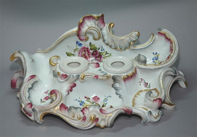 ÉCRITIORE de forme rocaille mouvementée pour deux godets encriers et deux trous pique plume et quelques rangements sous forme de coquilles. Le décor est à motifs floraux et les bordures sont surlignées d'or, de pourpre et de gris.