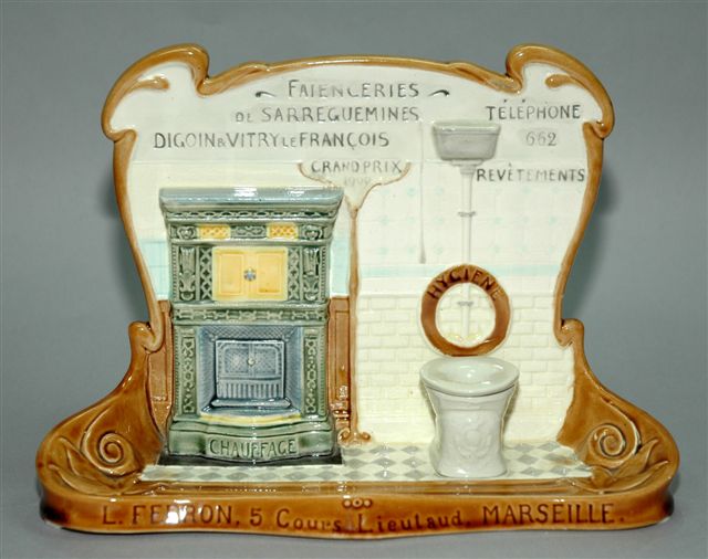 ÉCRITOIRE avec plumier, encrier et range lettres à but publicitaire pour les FAÏENCERIES de SARREGUEMINES à l'usage et au nom de leurs dépositaires revendeurs. Cet exemplaire est au nom de L. FERRON à Marseille. Outil de communication par excellence il présente la palette des productions de Sarreguemines : éléments d'architecture, chauffage, carrelage de sol et revêtements muraux, sanitaires dont la cuvette sert d'encrier. Marque rectiligne en creux SARREGUEMINES.