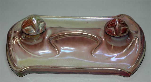 ENCRIER Art Nouveau en grès modèle n° 377 du catalogue de 1920, dénommé "ONDOYANT". Le plateau présente deux espaces plumiers de chaque côté d'un rehaut central pour deux godets encriers avec bouchons de part et d'autre d'une prise centrale. Le décor reprend des motifs art nouveau sous couverte d'émail flammés à reflets métalliques cuivrés.