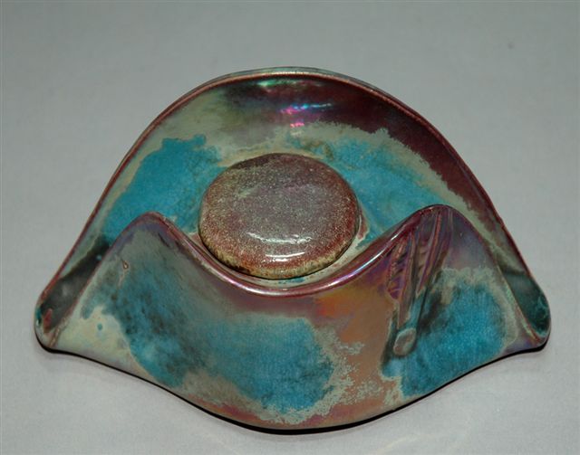 ENCRIER fantaisiste en grès représentant un chapeau de gendarme pour un encrier avec bouchon. Le décor est à émaillage flammé à reflets métalliques cuivrés bleu, vert.