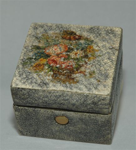 ENCRIER de VOYAGE dans un étui de forme cubique en laiton ou cuivre habillé de galuchat gris ornementé d'un bouquet de fleurs sur le couvercle charnière avec ouverture par bouton poussoir. L'intérieur recèle le flacon encrier cubique en verre obturé par un fermoir bouchon à système de pression.