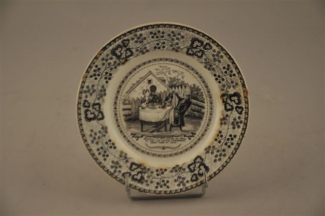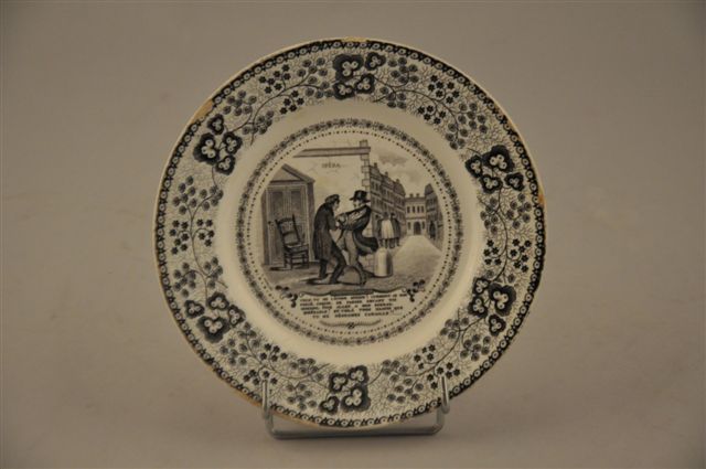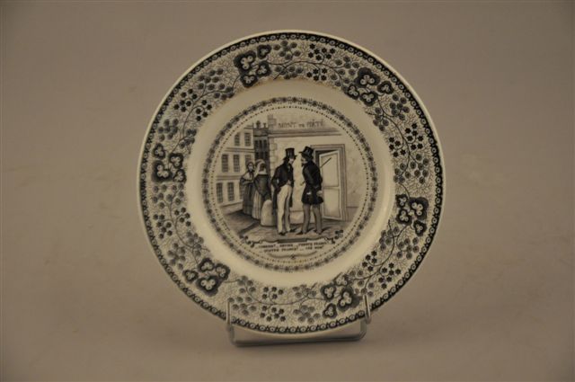 SUITE DES DOUZE ASSIETTES DU "MUSÉE POUR RIRE" en faïence à bord uni, à décor en impression de noir, au centre de scènes humoristique et sur l'aile de dentelles de fleurs. Gravure de J. Copeland (six ébréchées).