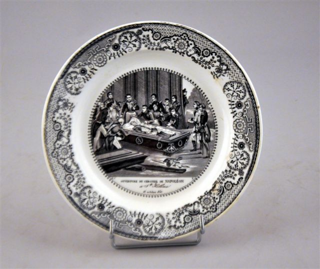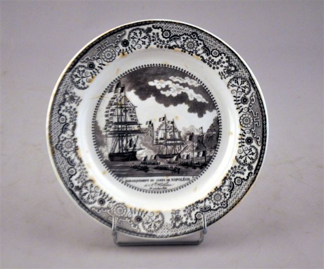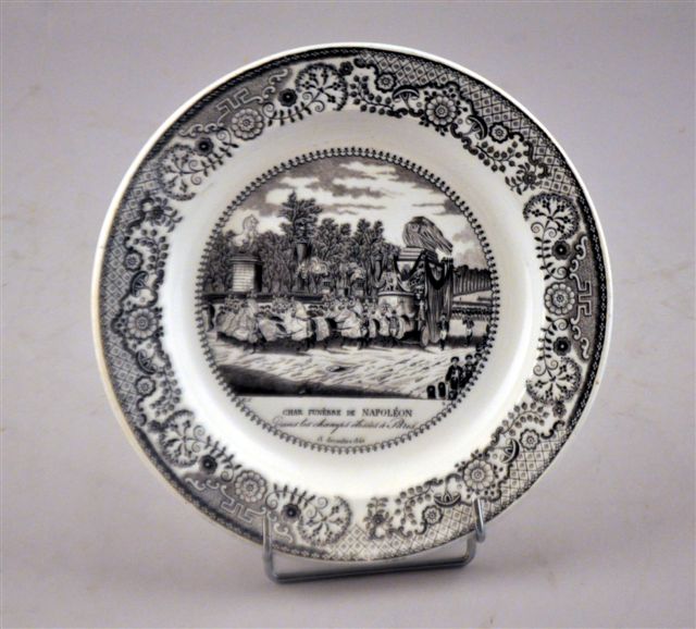 SUITE DE DIX ASSIETTES DES FUNÉRAILLES DE NAPOLÉON en faïence à bord uni, à décor en impression de noir, au centre d'une scène des funérailles de l'Empereur, dans l'aile de guirlandes et dentelles de fleurs. Gravure signée E.J. dans le décor (une ébréchée, certaines légèrement tachées).