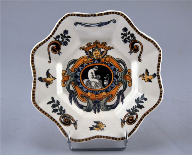 ASSIETTE polylobée en faïence, à décor polychrome au centre d'un cartouche couronné et sur l'aile de rinceaux fleuris, guirlande et oiseaux, sur fond blanc dans le goût de le Renaissance italienne.