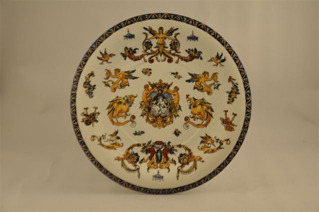 Grand PLAT ROND en faïence, à décors d'un amour chevauchant un dauphin sur fond noir dans un cartouche couronné aux puttis dans un entourage de chimères, trophées et dauphins sur un fond ivoire, dans le goût de la Renaissance italienne (Urbino), le contour souligné d'une frise à fond bleu.