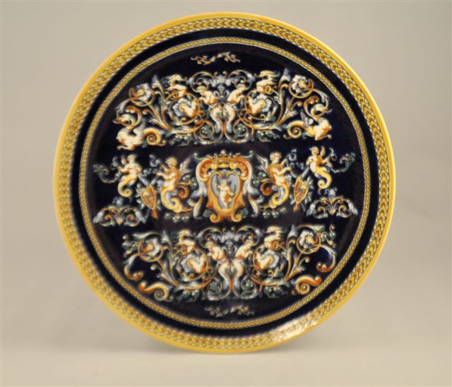 Grand PLAT ROND en faïence à bord uni, à décor polychrome d'un amour dans un cartouche entouré de grotesques et de rinceaux sur fond bleu dans le goût de la Renaissance Italienne.