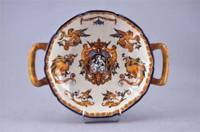 MELONNIÈRE À ANSES jaunes en faïence de forme ronde, à décor d'un amour au dauphin dans un écusson couronné à fond noir dans un entourage d'animaux fantastiques, chimères et grotesques sur fond blanc dans le goût de la Renaissance italienne.
