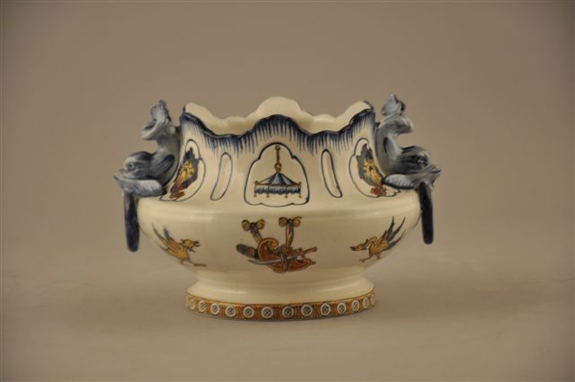 Petite JARDINIÈRE ROCAILLE ronde à anses de dauphins" en faïence, dans le goût de SEVRES, à bords découpés et à décor "a trofei" sur fond blanc dans le goût de la Renaissance italienne.