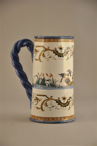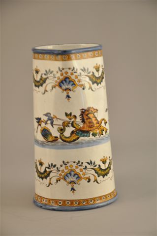 PICHET "AU CHEVAUX DE NEPTUNE" en faïence à anse torsadée, à décor de chevaux marins tirant une coquille conduite par des oiseaux à travers les roseaux, lambrequins encadrant la scène sur fond blanc dans le goût de la Renaissance italienne. Frise géométrique au col et à la base, liseré bleu.