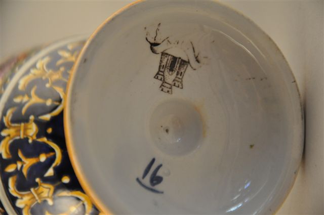 AIGUIÈRE DE "VÉNUS À L'AMOUR" ET SON PRÉSENTOIR en faïence, anse jaune à tête de griffon. Riche décor polychrome sur le corps de l'aiguière et l'aile du présentoir figurant dans trois cartouches à fond brun-chocolat "Vénus et l'amour" d'après la tradition italienne reprise à Nevers. Les cartouches se détachent sur un fond bleu nuit alternant avec des motifs jaune et turquoise d'arabesques, de chimères et de masques. Le centre du présentoir légèrement bombé présente un portrait de guerrier casqué (accident, anse recollée).
