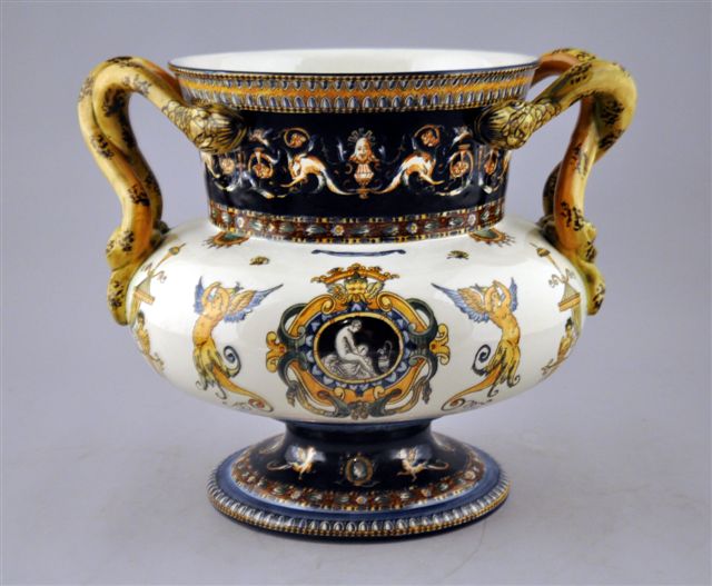 VASE MÉDICIS "AUX SERPENTS" en faïence, à ventre sur pied, les anses en forme de couples de serpent. Le décor dans le goût de la Renaissance Italienne d'un cartouche couronné à fond noir sur un fond ivoire parsemé de chimères, amours, papillons et déesse de la moisson. Le col et le socle ornés d'une frise d'animaux fantastique sur fond bleu nuit.