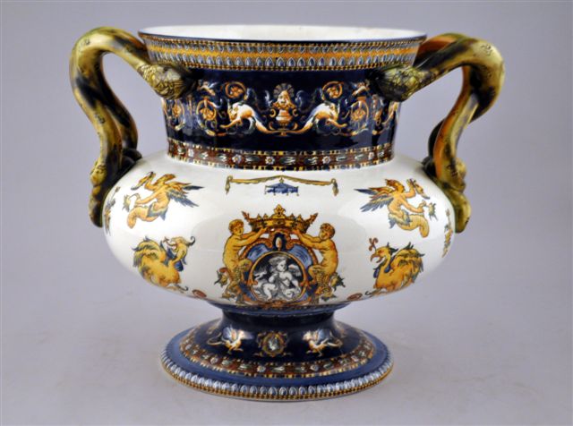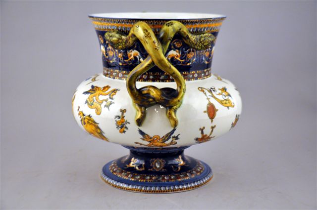 VASE MÉDICIS "AUX SERPENTS" en faïence, à ventre sur pied, les anses en forme de couples de serpent. Le décor dans le goût de la Renaissance italienne d'un cartouche à l'amour marin couronné à fond noir sur un fond ivoire parsemé de chimères, amours, papillons et déesse de la moisson. Le col et le socle ornés d'une frise d'animaux fantastique sur fond bleu nuit (piédouche accidenté et restauré, éclat au col).