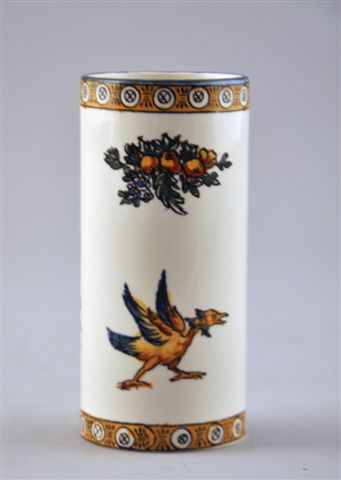 VASE ROULEAU en faïence à décor d'une victoire ailée, d'oiseau fantastique et de fruits sur fond blanc dans le goût de la Renaissance italienne. Frise en pied et au col.