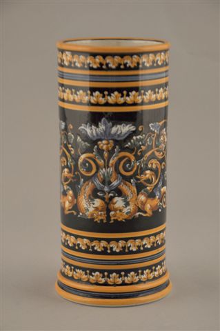 VASE ROULEAU en faïence, à décor de grotesque sur fond noir dans le goût de la Renaissance Italienne.