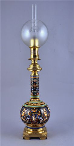 LAMPE À HUILE BOULE À COL en faïence, à décor d'un amour à l'écusson couronné dans un entourage de grotesques, entrelacs, rinceaux et chimères sur fond brun dans le goût de la Renaissance italienne. Belle polychromie où dominent les ocres, les jaunes orangés, les bruns, un bleu ainsi qu'un liseré vert d'eau à décor italien sur rare fond chocolat. Monture de bronze doré.