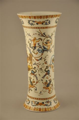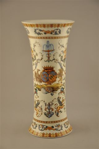 Grand VASE CORNET HÉRALDIQUE À CANDELIERI en faïence. Décor polychrome composé d'une part d'un écu à double médaillons sous une couronne comtale encadré par un aigle et une chimère et d'autre part d'un Candelieri composé d'une double fontaine fleur-de-lysée aux dauphins dans un entourage d'arabesques, de chimères, d'oiseaux fantastiques, de satyres et d'angelots sur fond blanc, dans le goût de la Renaissance italienne. Fond annelé.